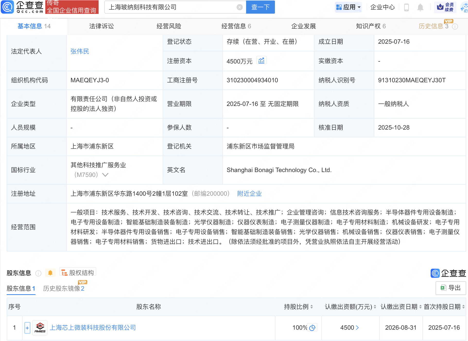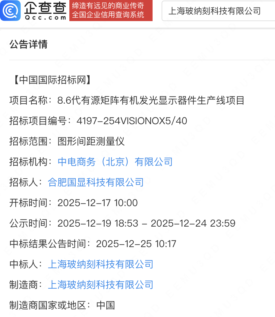 近日,上海玻纳刻科技有限公司中标8.6代有源矩阵有机发光显示器件生产线项目,招标人为合肥国显科技有限公司。企查查信息显示,上海玻纳刻科技有限公司成立于2025年7月,经营范围包含:半导体器件专用设备制造;电子专用设备制造;智能基础制造装备制造;光学仪器制造等,由上海芯上微装科技股份有限公司全资持股。公开信息显示,芯上微装是一家专注于高端半导体装备研发、生产和服务的科技企业,其核心业务包括光刻机的设计与制造。