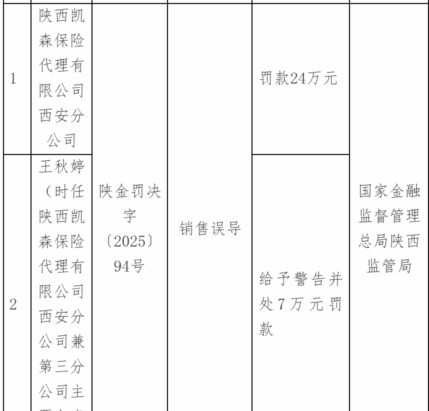 12月25日,国家金融监督管理总局陕西监管局行政处罚信息公示表显示,陕西凯森保险代理有限公司西安分公司因销售误导被罚款24万元;王某婷被警告并处7万元罚款。